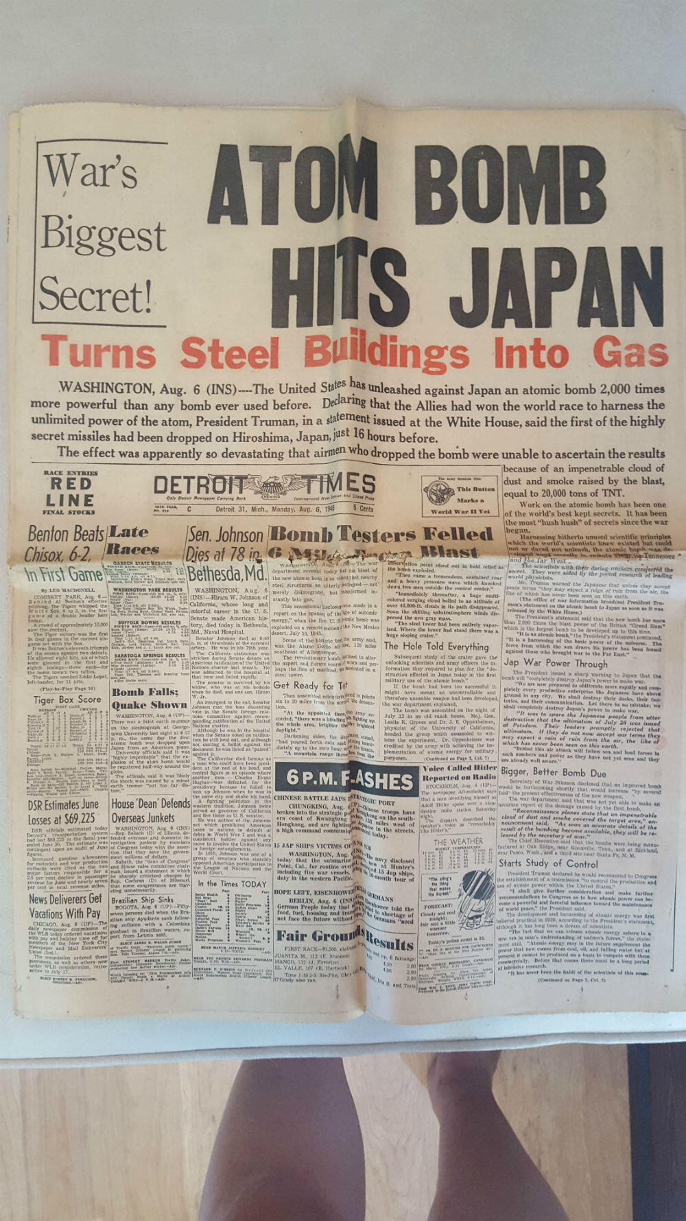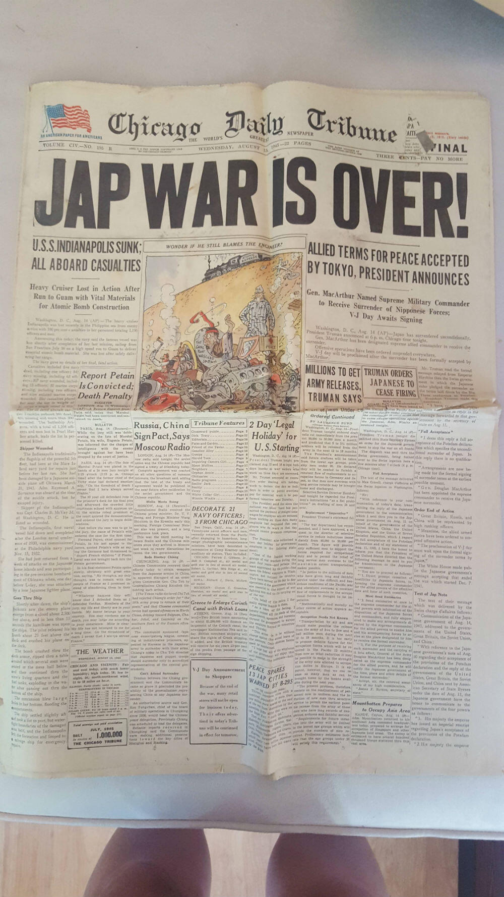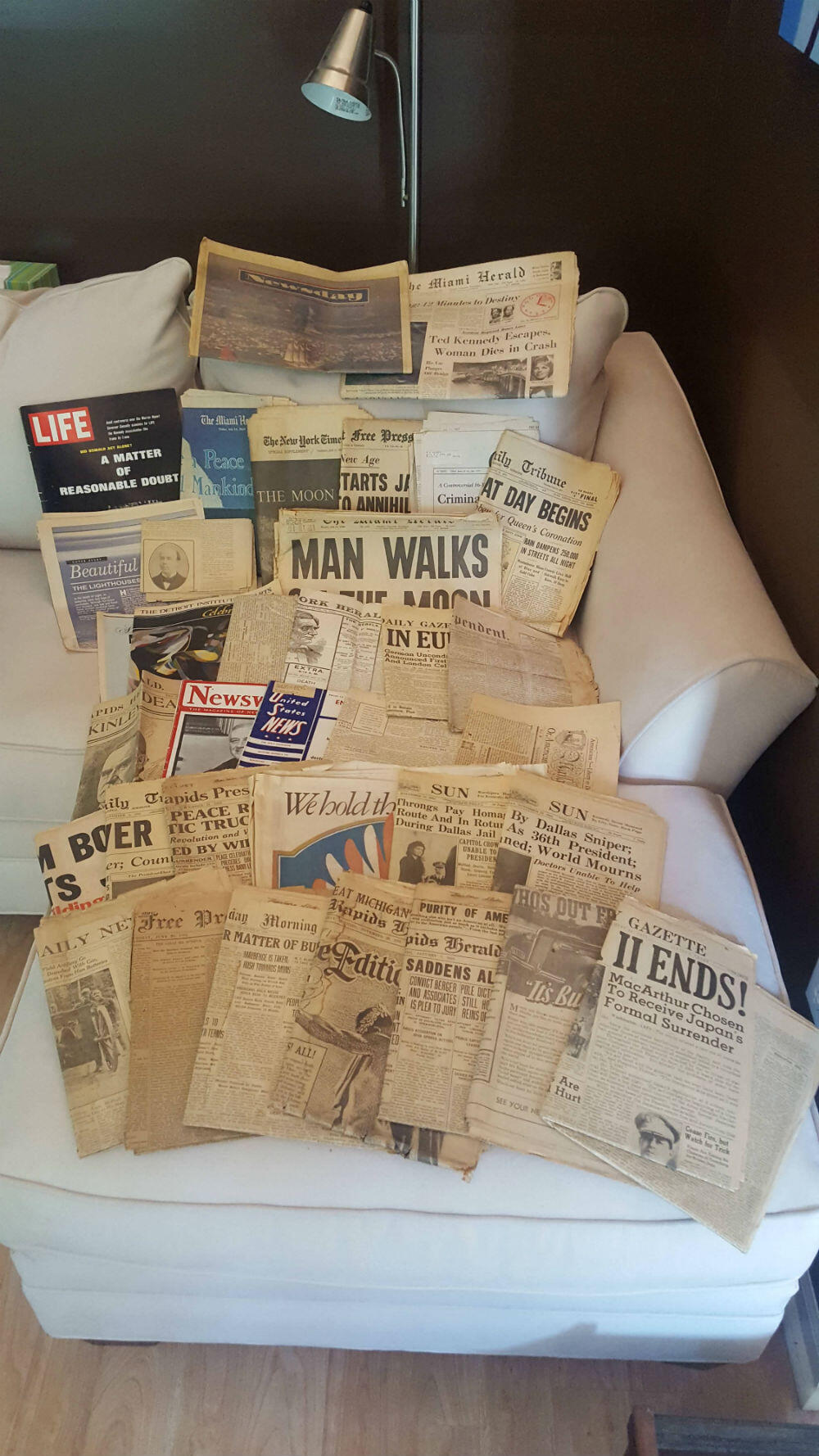 Il s’agit de plusieurs journaux et unes de journaux. Mais pas n’importe lesquels : des unes historiques, relatant et illustrant des moments-clé du XXe siècle. S’il s’agit clairement de la collection de ses grands-parents, la jeune fille suppose que certains numéros – les plus anciens – ont été conservés par ses arrières-grands-parents. Une tradition de famille, donc.